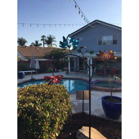 You’ll enjoy a beautiful outdoor kinetic wind spinner with a three tier flower cascade of yellow, pink and blue blooms and butterfly accents. The eye-catching, colorful floral design is brought into motion whenever the wind blows.