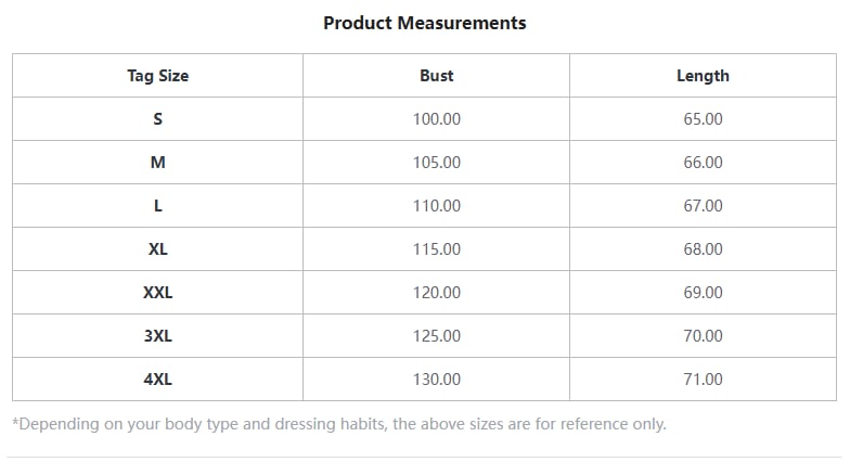 | Size | Length | Bust | ||