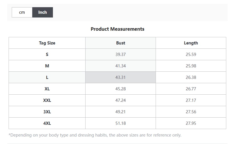 | 3XL | 70 | 27.6 | 125 | 49.2 |